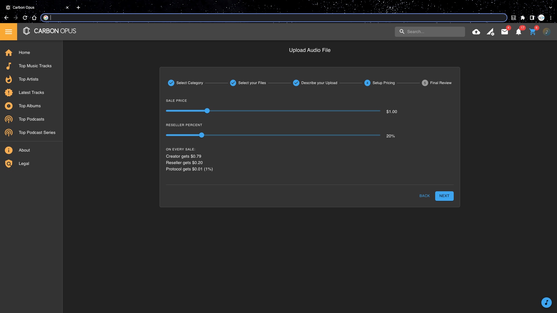Creators/Artists get to choose the price and license for each Audio Track they upload (Music, Beats, Podcasts, etc.) as well as the Royalty Distribution for their Fans (resellers). This dynamic puts full-control of Music Distribution into the hands of the Creators & Fans. Royalties can be further split with collaborators, where various parts (beats, vocals) of a song can come from other Creators who will receive automatic royalties and attribution.